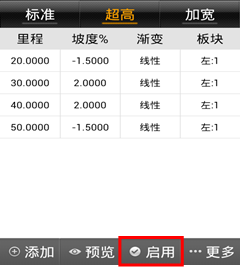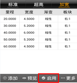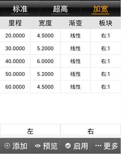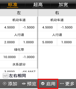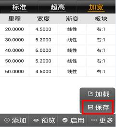 可任意切换标准、超高、加宽查看数据录入情况,确认无误后,3个界面任意点击启用均将当前横断面(标准断面+超高+加宽)应用于道路中,也可点击更多-保存成.TPL文件以便后续加载重复使用(底部按钮各界面点击效果一样)