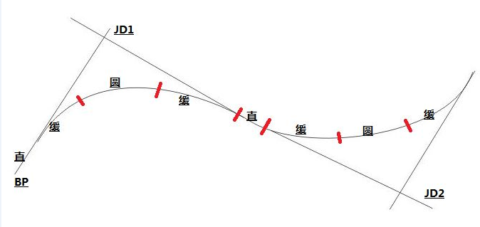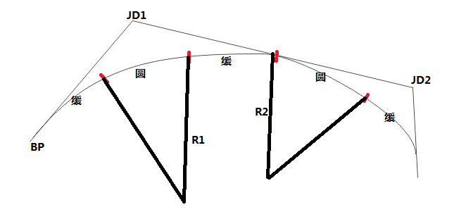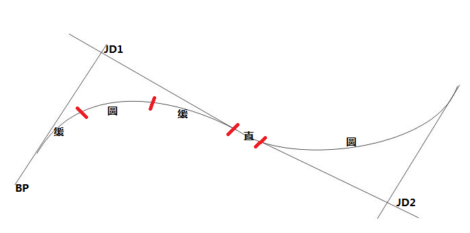各交点内所夹线元为:缓缓和曲线-圆曲线-缓和曲线,只有圆曲线