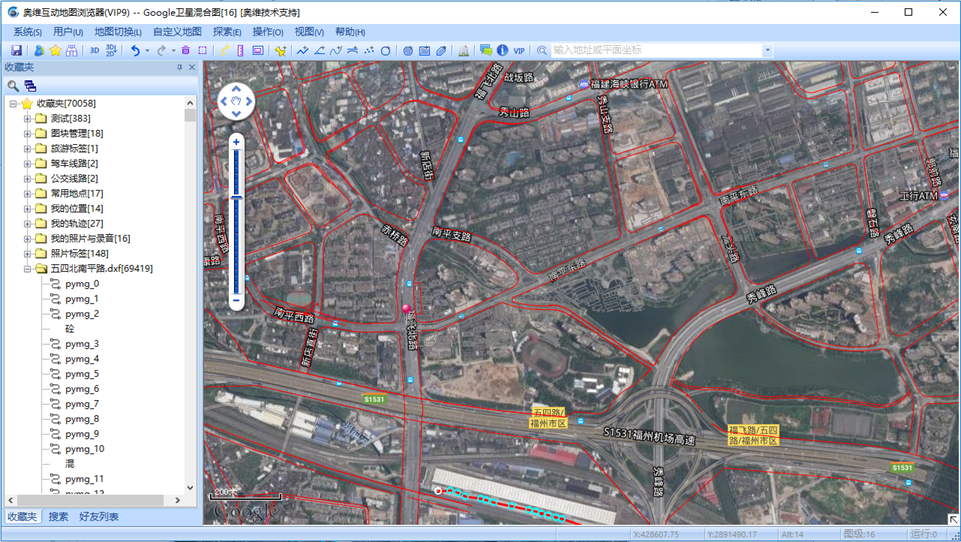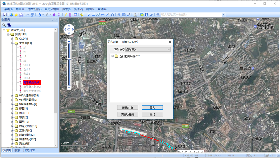 (3)解析完成后显示将要被导入的对象文件夹及对象数量,点击【导入】后,CAD图被导入到收藏夹,并显示在地图上,效果如下图: