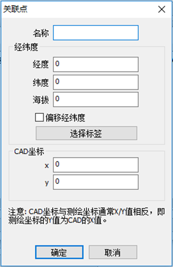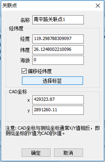 系统自动填写关联点的名称、经纬度、CAD坐标值,如下图:
